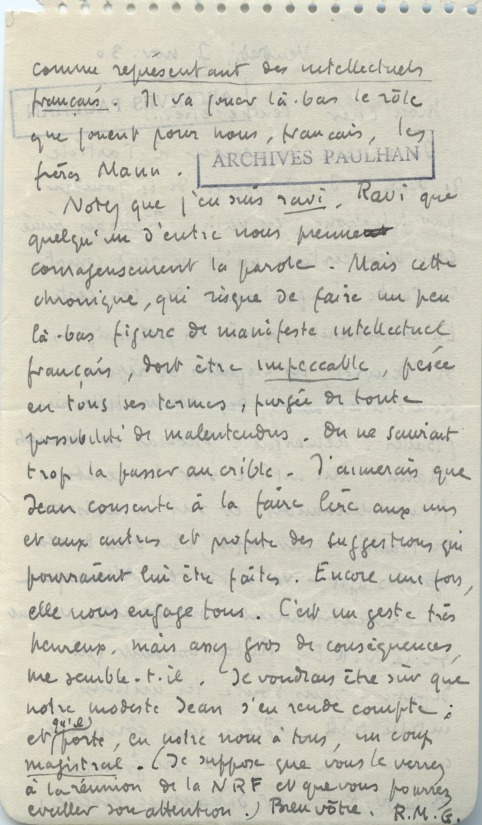 Lettre de Roger Martin du Gard à Jean Paulhan, 1930-11-07