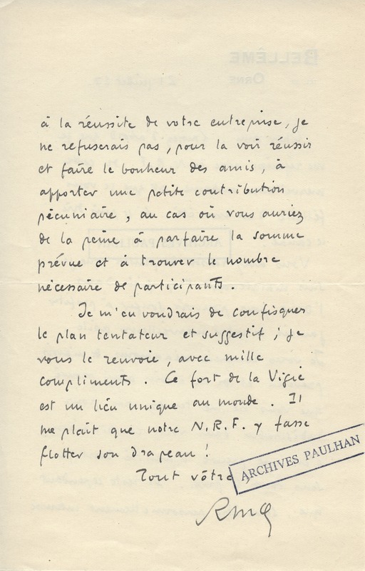 Lettre de Roger Martin du Gard à Jean Paulhan, 1927-07-21