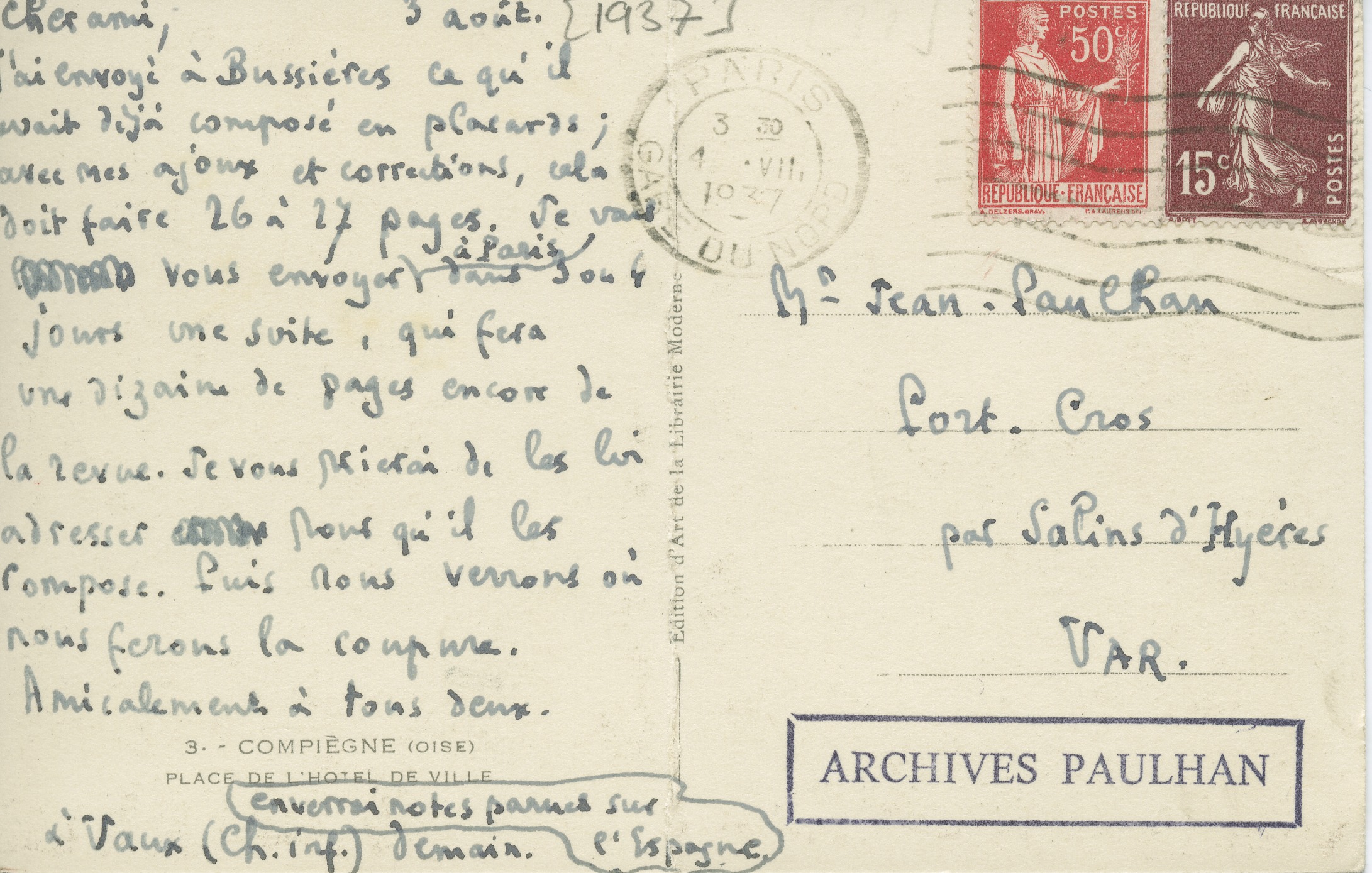 Lettre de Julien Benda à Jean Paulhan, 1937-08-03 ⇾